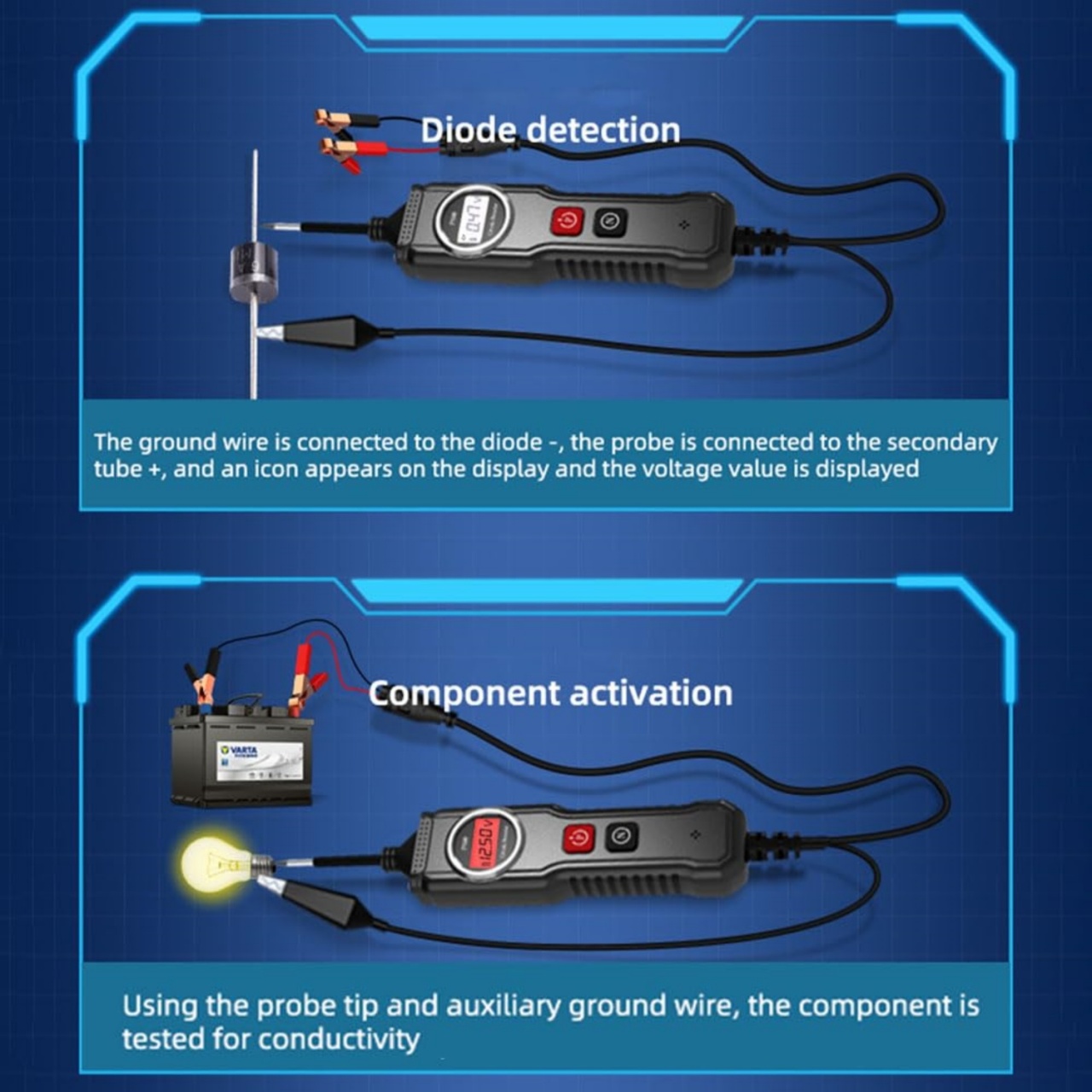 Testerul de tensiune auto YM-P100 este un instrument profesional 8 in 1 pentru diagnoza rapida a sistemelor electrice ale vehiculelor. Este compatibil cu toate masinile si utilajele care functioneaza intre 12V si 24V. Permite verificarea tensiunii, polaritatii, continuitatii, impamantarii, diodei, activarii componentelor, si rezistentei. Functii principale ✅ Detectare tensiune (0.01V–107V DC) ✅ Testare polaritate pozitiva/negativa ✅ Test continuitate si impamantare ✅ Detectare dioda si activare componente ✅ Testare rezistenta cu afisaj pe ecran ✅ Mod inteligent Auto-Mode pentru detectie automata ✅ Iluminare LED pentru lucru in zone intunecate ✅ Ecran LCD iluminat pentru afisaj clar zi si noapte Compatibilitate ✔️ Masini 12V-24V ✔️ Camioane, SUV-uri, excavatoare, utilaje grele, autoturisme Pachetul contine 1x Tester YM-P100 1x Cablu cu cleme crocodil 1x Manual de utilizare Specificatii Interval tensiune: 0.01–107V DC Alimentare: 12V/24V direct din baterie sau 2x AAA (neincluse) Lungime cablu: ~5 metri Iluminare frontala integrata Dimensiune tester: 21cm lungime